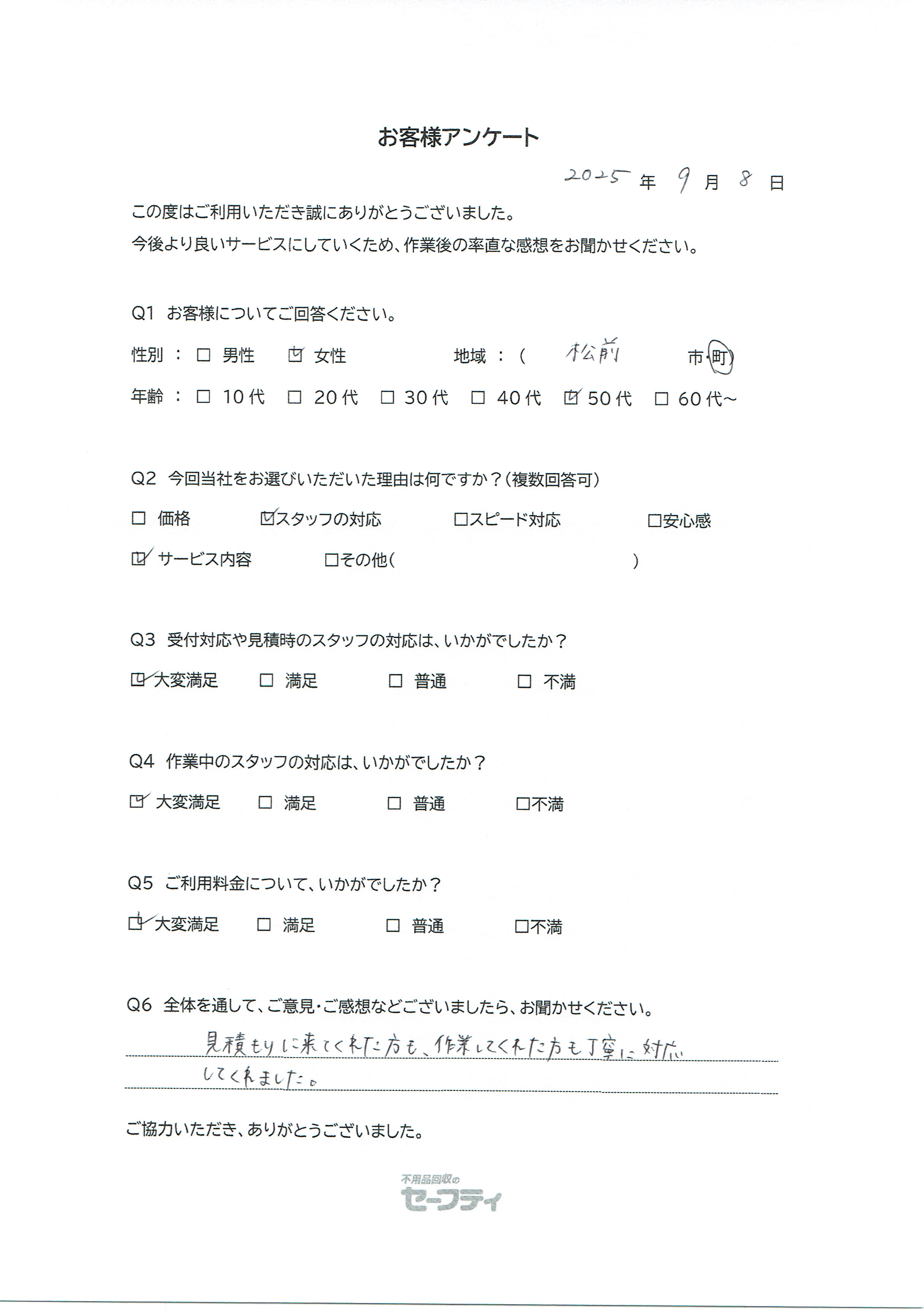 松前町Iさま(遺品整理ご利用のお客様アンケート)