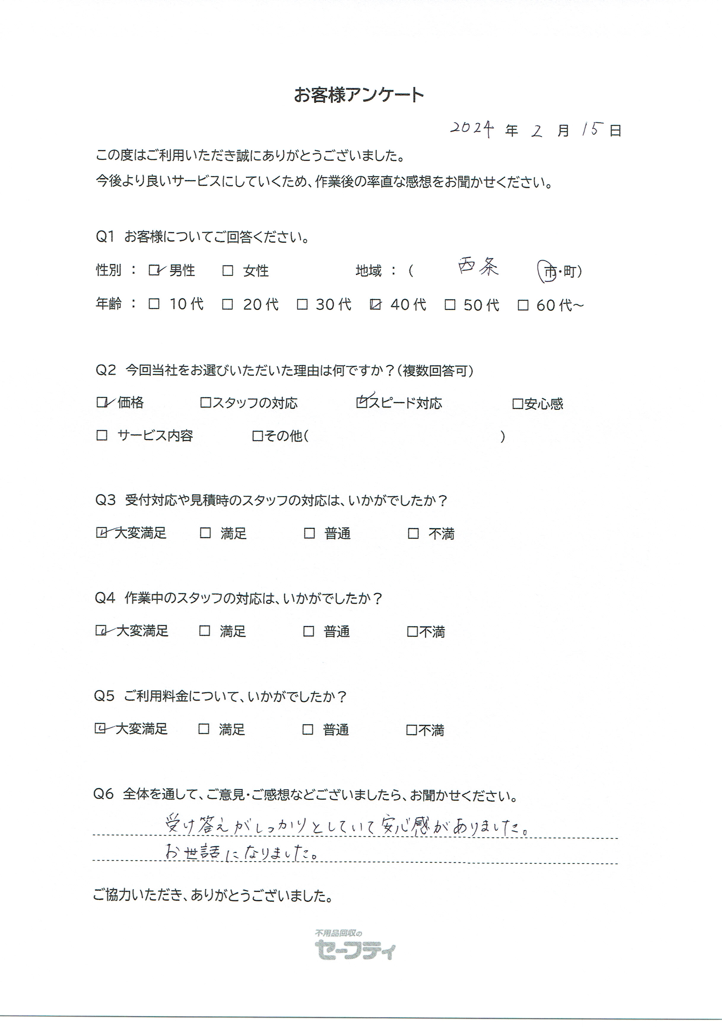西条市Mさま(不用品回収ご利用のお客様アンケート)